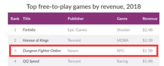 《地下城与勇士》成为nexon在中国市场最大的摇钱树,2016年同时在线人数超500万,仍在为nexon贡献巨额营收。2017年第一季度营收共计45.4亿元,《地下城与勇士》光是在中国区就贡献了27.4亿; 时至今日,《地下城与勇士》一年依然能赚到15亿美元,是全世界第三大赚钱的端游。superdata统计,2018年收入最高的游戏中,nexon的地下城与勇士位居第三位,收入达15亿美金,仅次于《堡垒之夜》和《王者荣耀》。