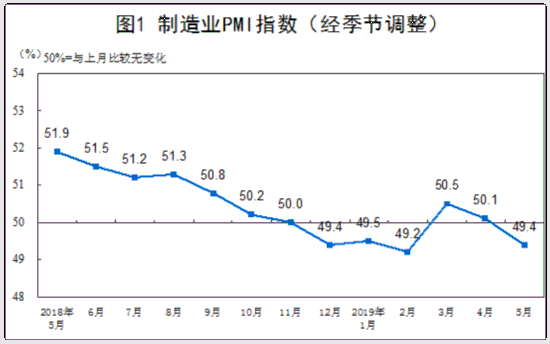 2019年5月份,中国制造业采购经理指数(pmi)为49.4%,比上月回落0.7个百分点。