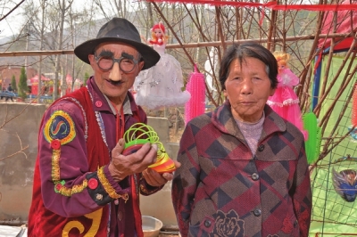 刘宪章在偃师山张庙会上边表演,边卖玩具。收入成为他和妻子旅行的费用。