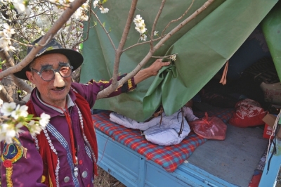 这辆“房车”,其实是一辆有点年头的机动三轮改装的,深绿色的帆布斗篷布覆盖了车厢,垂下的布帘形成了一个隐秘的小世界。“冬天的时候,外面天冷得不行,车里面暖和得很,一点儿都不冷。”