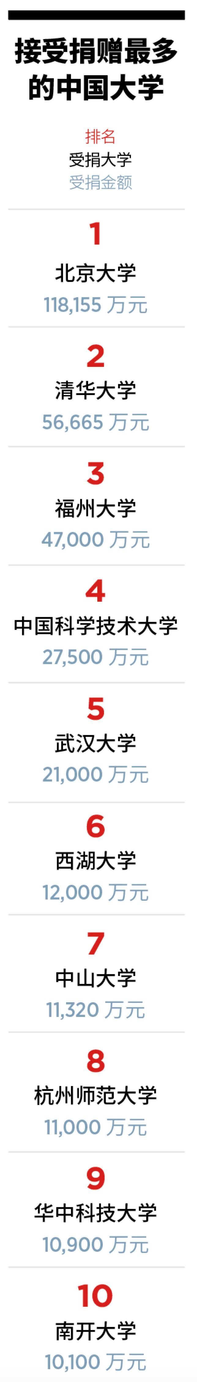 榜单显示,2018 年,国内各高校共计受捐43.6亿元,前十名受捐大学分别是北京大学、清华大学、福州大学、中国科学技术大学、武汉大学、西湖大学、中山大学、杭州师范大学、华中科技大学、南开大学。可以看到,位列前三的北京大学、清华大学、福州大学受到的捐赠金额占据了总金额的一半。事实证明,著名大学更容易获得来自校友的捐赠,在强大的资金支持下,这些高校的整体实力能够得到明显的提升,从而形成一个良性循环,吸引更优质的生源。