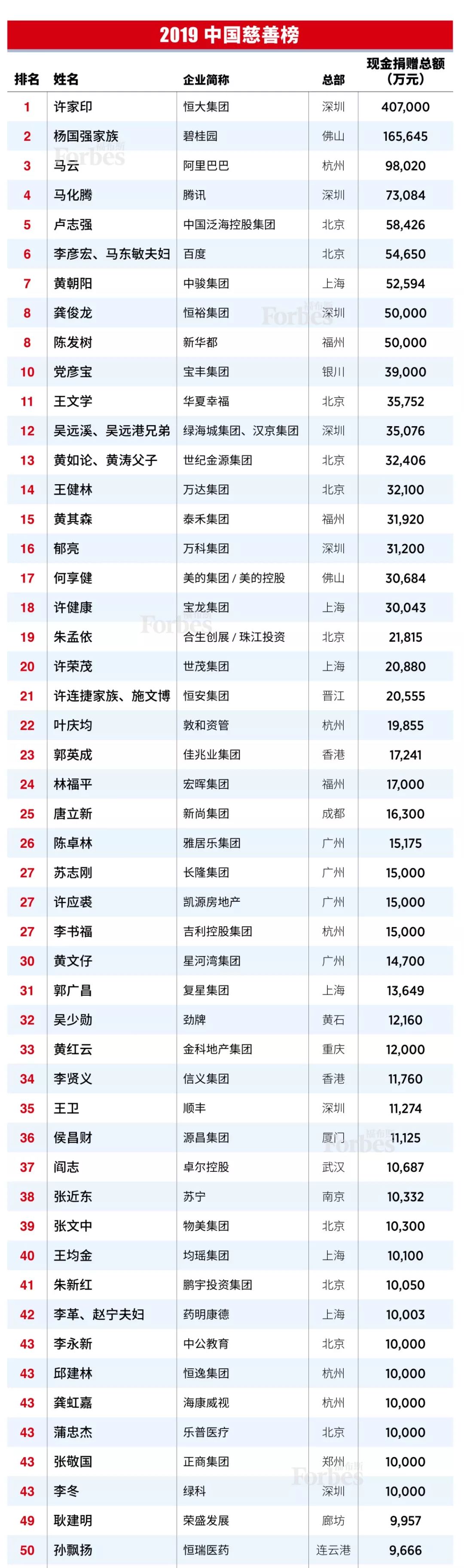 今年共有100 位企业家上榜,恒大集团董事长许家印、碧桂园主席杨国强家族、阿里巴巴董事局主席马云分别以40.7 亿、16.5 亿及9.8 亿元人民币的现金捐赠总额名列前三。