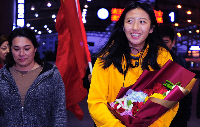 丁霞也是非常开心,迎接的人员说:您辛苦了,丁霞赶紧说到:没有没有。球迷们也是高举着横幅,上面写着:欢迎世界杯冠军丁霞回辽宁!然后全体进行了合影,丁霞也是很开心,抱着鲜花和送上来的礼物一起合影。很多人都没有注意,丁霞刚一下车之后受到了热烈欢迎,随后得知要合影的她赶紧摘下了帽子,她摘下帽子的瞬间确实太美了。