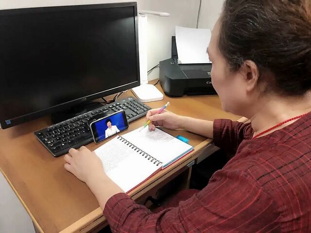 每天起床打开房门,女婿余先生就能看到万雪琴坐在沙发或餐桌边看网课。余先生告诉记者,有段时间母亲手机坏了无法外出维修,为了不耽误她学习,就给她网购了一部手机。“择菜的时候都在看,这是她喜欢做的事,劝她少看会儿都不听。”