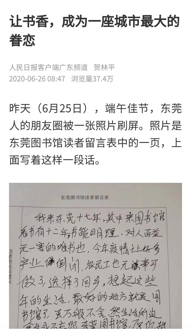 “我来东莞十七年,其中来图书馆看书有十二年。书能明理,对人百益无一害的唯书也。今年疫情让好多产业倒闭,农民工也无事可做了,选择了回乡。想起这些年的生活,最好的地方就是图书馆了。虽万般不舍,然生活所迫,余生永不忘你,东莞图书馆。愿你越办越兴旺。识惠东莞,识惠外来民工。
